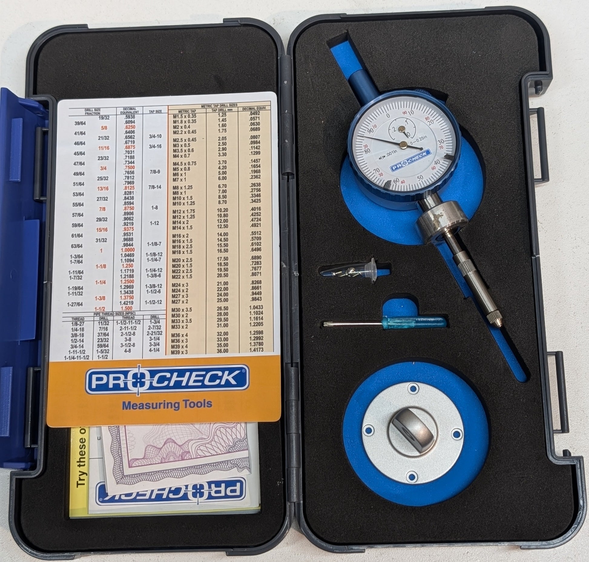 OUR 1-1/2" DIAMETER DIAL SETTING GUAGE HAS .250" TOTAL TRAVEL WITH A REACH OF ~1.7". IT FEATURES AN ALUMINUM COLLAR TO ALLOW THE USER TO SET THE GAUGE SQUARE TO THE COVER PLATE FOR EASY READING OF THE DIAL.